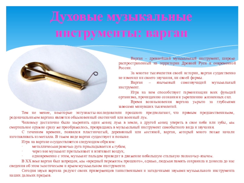 Варган – древнейший музыкальный инструмент, широко распространенный на территории Древней Руси и современной России.