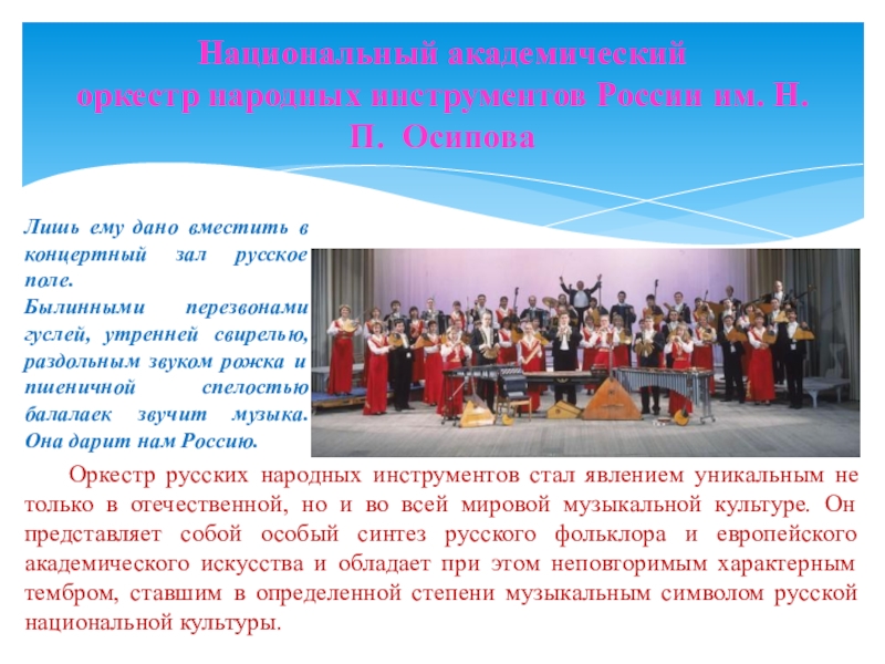 Оркестр русских народных инструментов стал явлением уникальным не только в отечественной, но и во всей мировой музыкальной культуре. Он представляет собой особый синтез русского фольклора и европейского академического искусства и обладает при этом неповторимым характерным тембром, ставшим в определенной степени музыкальным символом русской национальной культуры.