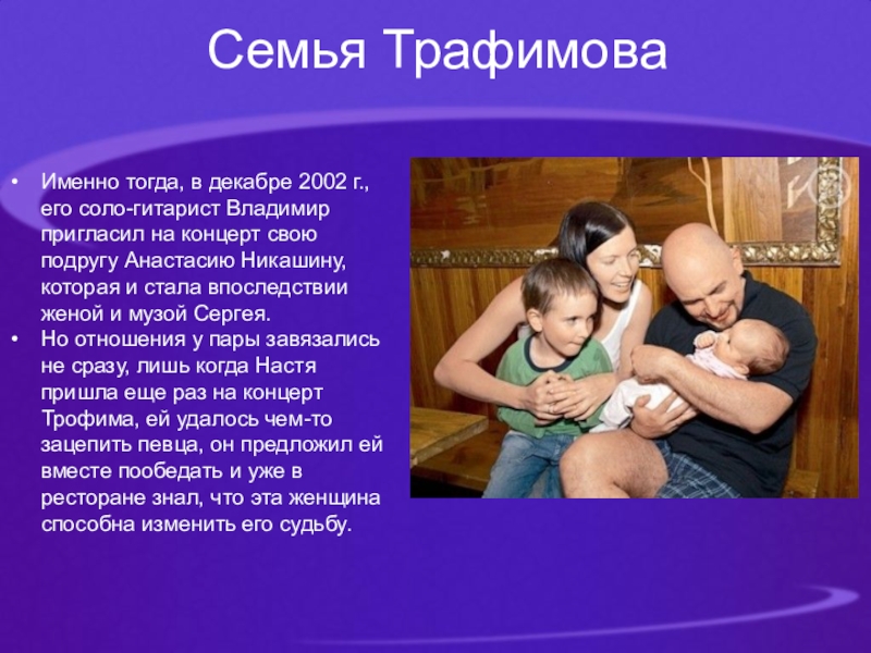 Семья ТрафимоваИменно тогда, в декабре 2002 г., его соло-гитарист Владимир пригласил на концерт свою подругу Анастасию Никашину,которая