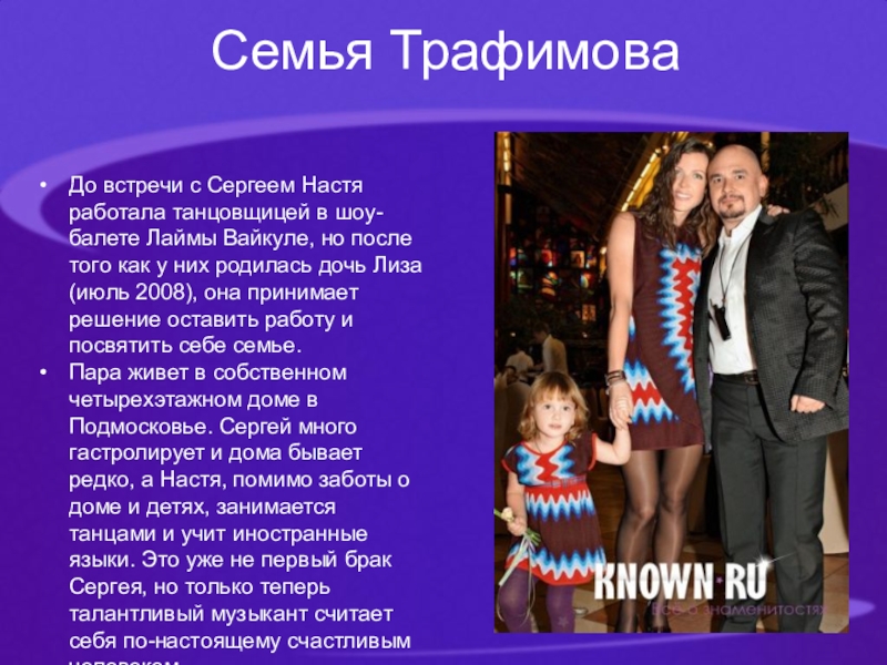 Семья ТрафимоваДо встречи с Сергеем Настя работала танцовщицей в шоу-балете Лаймы Вайкуле, но после того как у