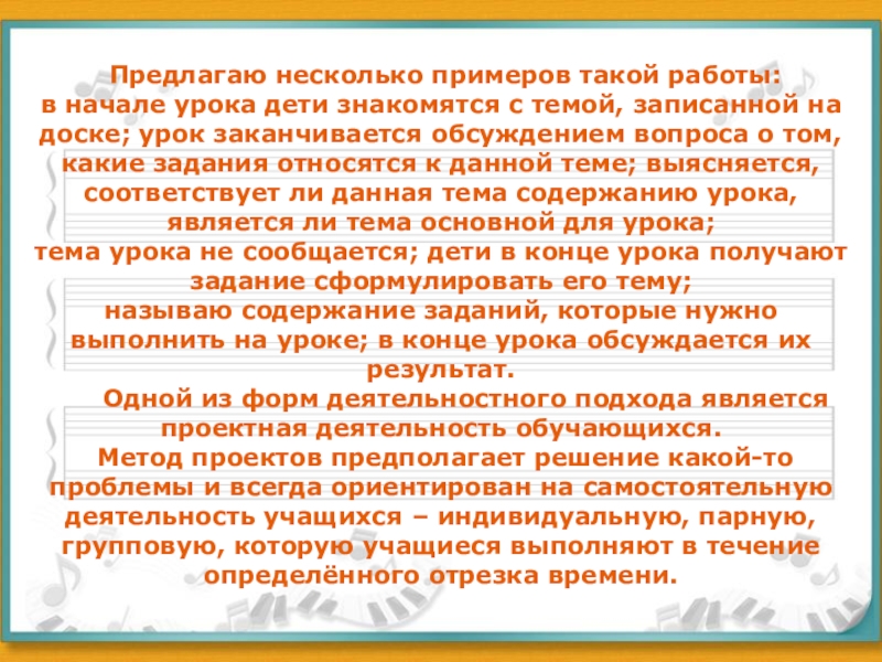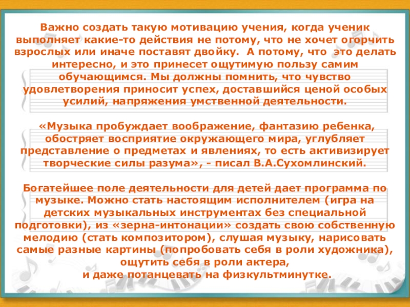 Богатейшее поле деятельности для детей дает программа по музыке. Можно стать настоящим исполнителем (игра на детских музыкальных инструментах без специальной подготовки), из «зерна-интонации» создать свою собственную мелодию (стать композитором), слушая музыку, нарисовать самые разные картины (попробовать себя в роли художника), ощутить себя в роли актера,
