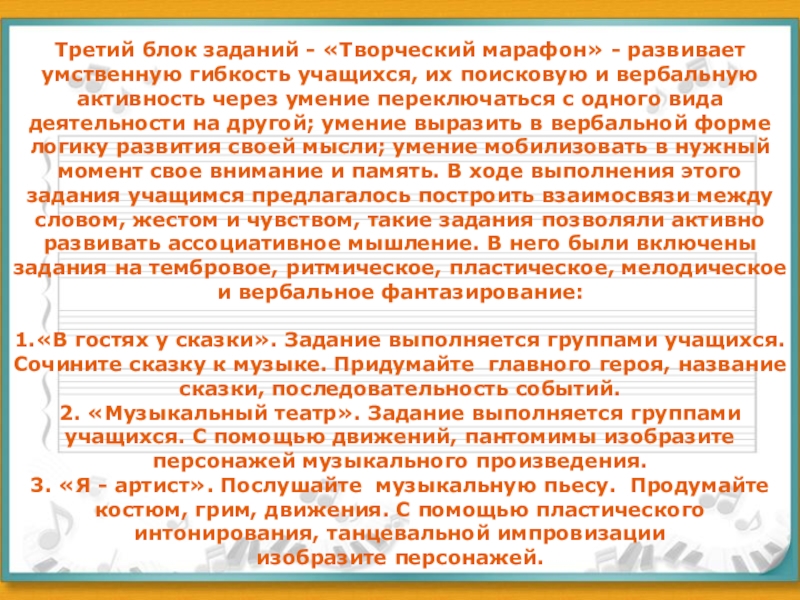 Слайд 12Первый блок заданий - «Музыкальная разминка» - направлен на развитие умений