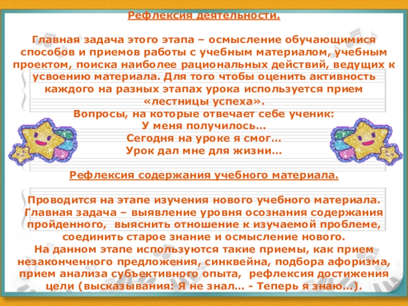 На данном этапе используются такие приемы, как прием незаконченного предложения, синквейна, подбора афоризма, прием анализа субъективного опыта, рефлексия достижения цели (высказывания: Я не знал… - Теперь я знаю…).