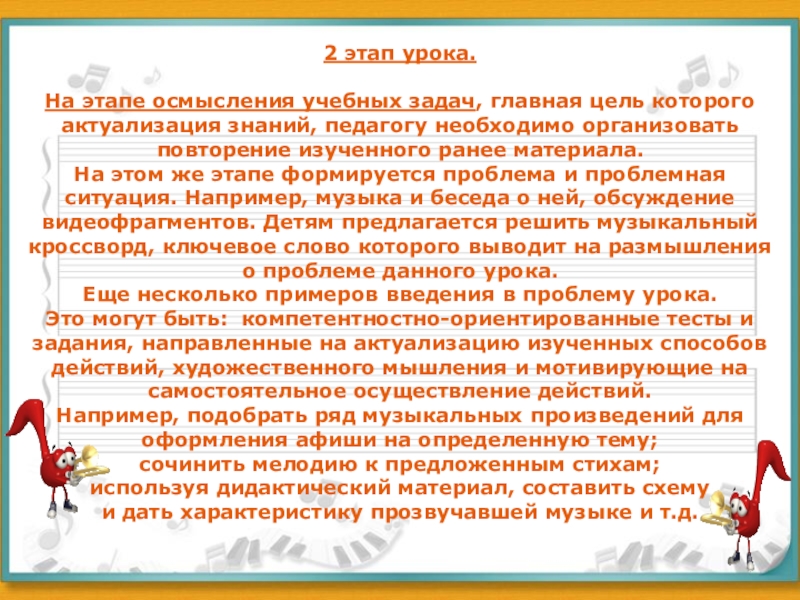На этом же этапе формируется проблема и проблемная ситуация. Например, музыка и беседа о ней, обсуждение видеофрагментов. Детям предлагается решить музыкальный кроссворд, ключевое слово которого выводит на размышления о проблеме данного урока.