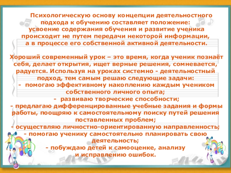 Слайд 9 Психологическую основу концепции деятельностного подхода к обучению составляет