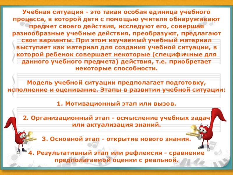 Модель учебной ситуации предполагает подготовку, исполнение и оценивание. Этапы в развитии учебной ситуации: