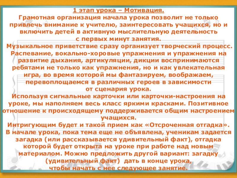 На музыкальных уроках в качестве мотивации может служить само музыкальное произведение – не редко таким ярким примером является классическая музыка, которую дети слышат по телевидению, в рекламах, музыкальных заставках, кинофильмах или в сопровождении сюжета документального фильма.