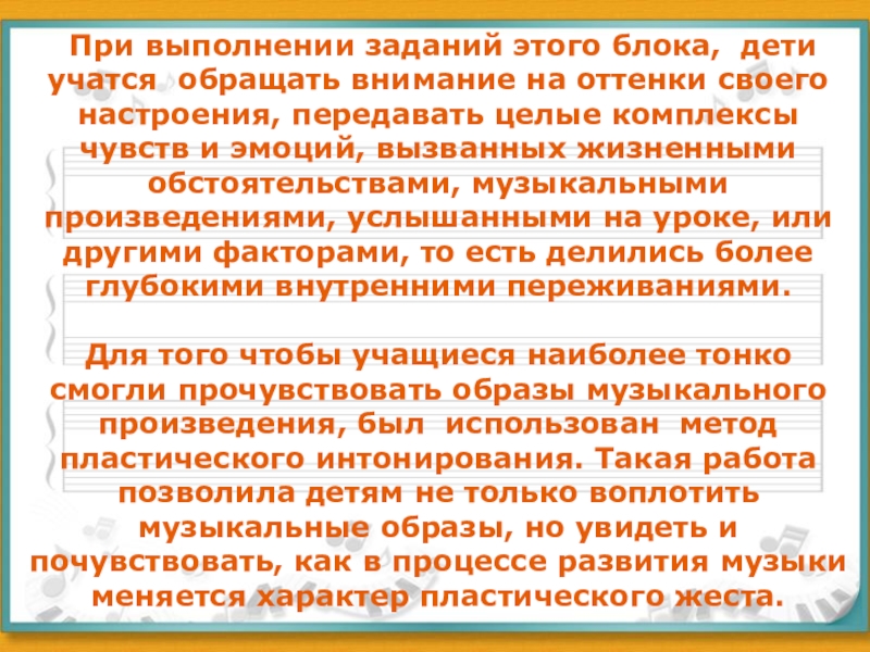 оттенки своего настроения, передавать целые комплексы чувств и эмоций, вызванных жизненными обстоятельствами, музыкальными произведениями, услышанными на уроке, или другими факторами, то есть делились более глубокими внутренними переживаниями.