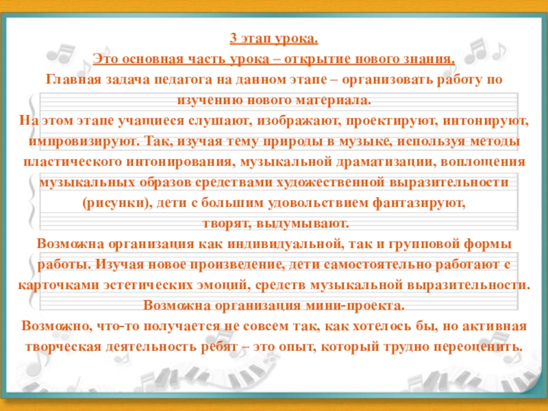 На этом этапе учащиеся слушают, изображают, проектируют, интонируют, импровизируют. Так, изучая тему природы в музыке, используя методы пластического интонирования, музыкальной драматизации, воплощения музыкальных образов средствами художественной выразительности (рисунки), дети с большим удовольствием фантазируют,