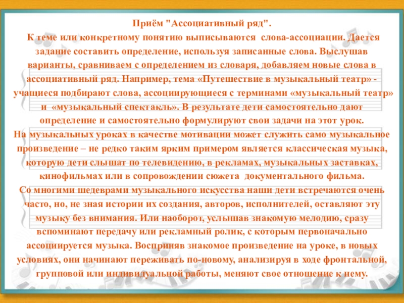 задание составить определение, используя записанные слова. Выслушав варианты, сравниваем с определением из словаря, добавляем новые слова в ассоциативный ряд. Например, тема «Путешествие в музыкальный театр» - учащиеся подбирают слова, ассоциирующиеся с терминами «музыкальный театр» и «музыкальный спектакль». В результате дети самостоятельно дают определение и самостоятельно формулируют свои задачи на этот урок.