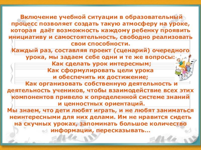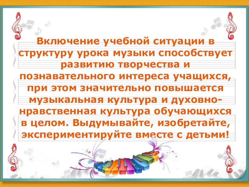 Слайд 30Включение учебной ситуации в структуру урока музыки способствует развитию творчества и