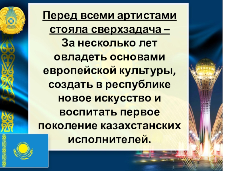 За несколько лет овладеть основами европейской культуры, создать в республике новое искусство и воспитать первое поколение казахстанских исполнителей.