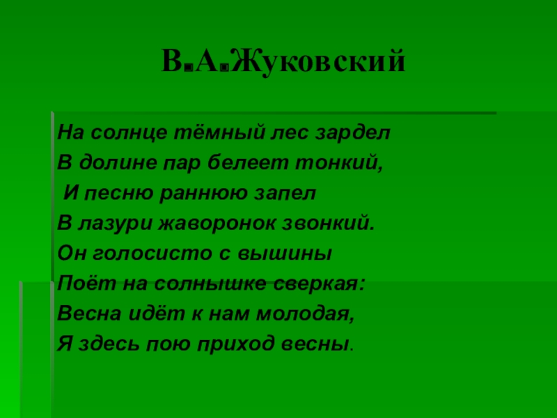 В.А.ЖуковскийНа солнце тёмный лес зарделВ долине пар белеет тонкий, И песню раннюю запелВ лазури жаворонок звонкий.Он голосисто