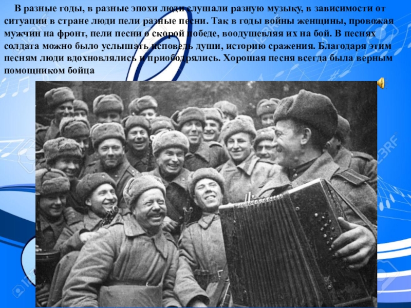 музыку, в зависимости от ситуации в стране люди пели разные песни. Так в годы войны женщины, провожая мужчин на фронт, пели песни о скорой победе, воодушевляя их на бой. В песнях солдата можно было услышать исповедь души, историю сражения. Благодаря этим песням люди вдохновлялись и приободрялись. Хорошая песня всегда была верным помощником бойца