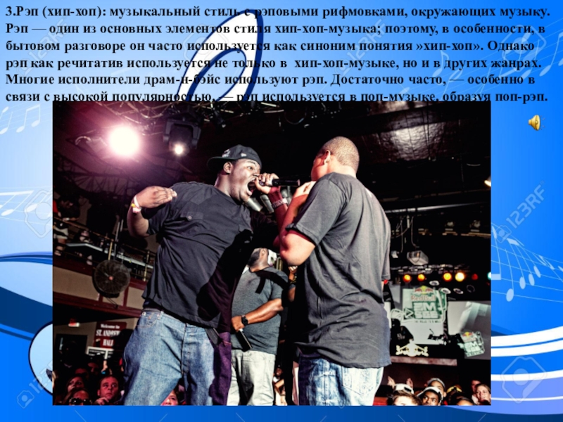 Слайд 83.Рэп (хип-хоп): музыкальный стиль с рэповыми рифмовками, окружающих музыку.