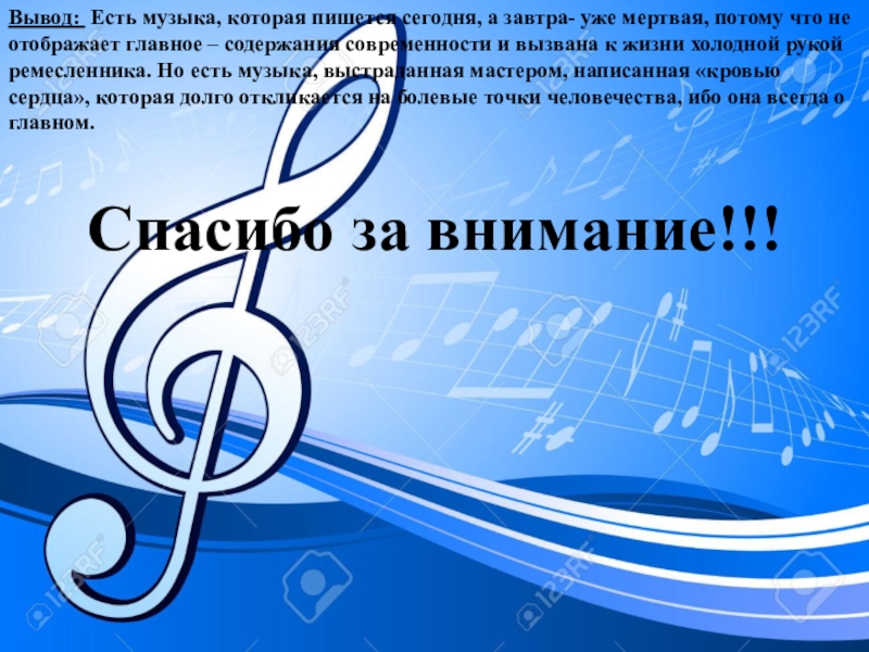 Слайд 12Вывод: Есть музыка, которая пишется сегодня, а завтра- уже мертвая, потому что