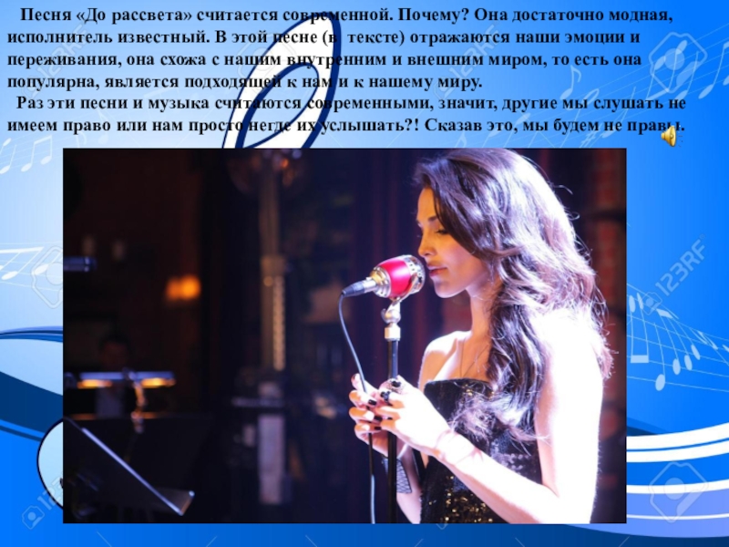 Слайд 4 Песня «До рассвета» считается современной. Почему? Она достаточно модная,