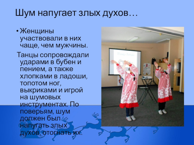 сопровождали ударами в бубен и пением, а также хлопками в ладоши, топотом ног, выкриками и игрой на шумовых инструментах. По поверьям, шум должен был напугать злых духов, отогнать их.