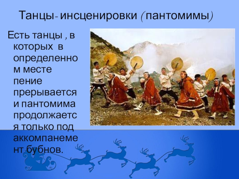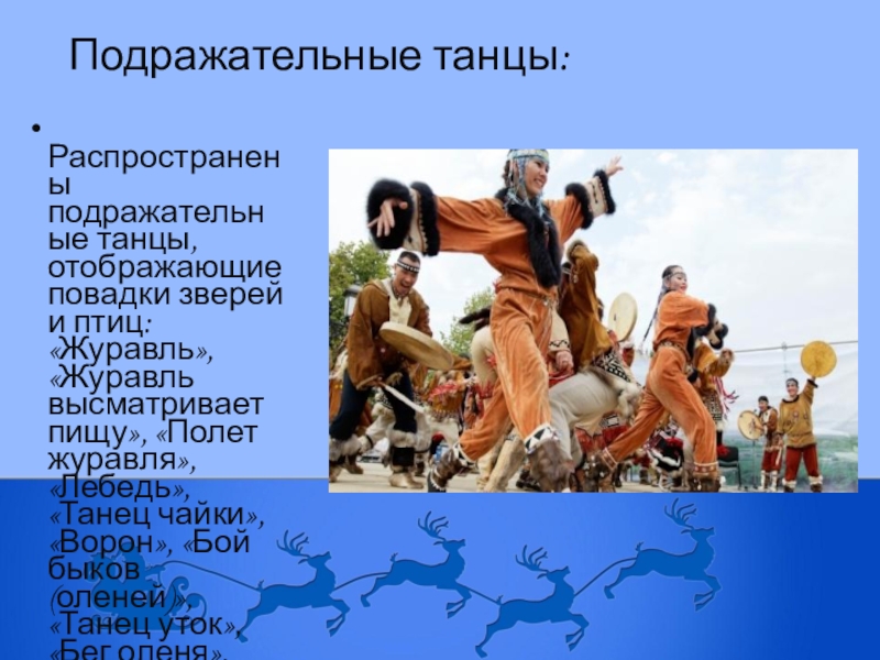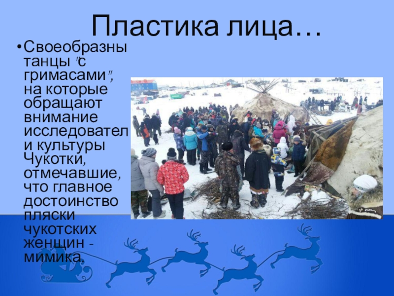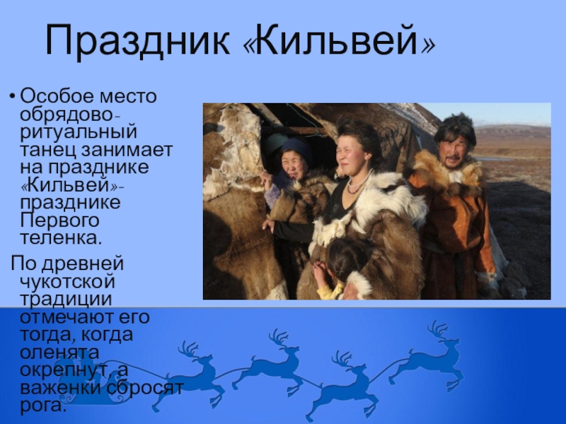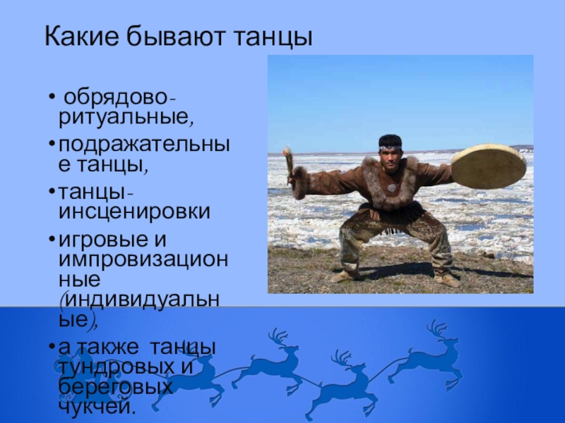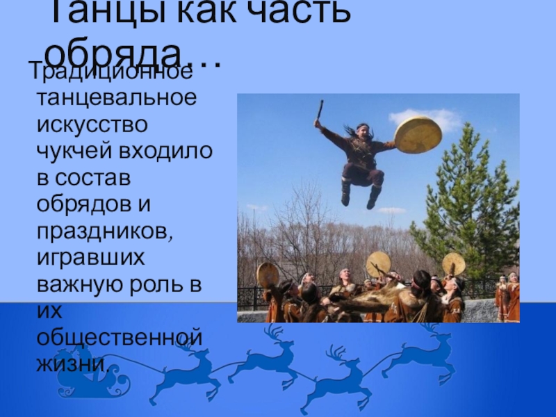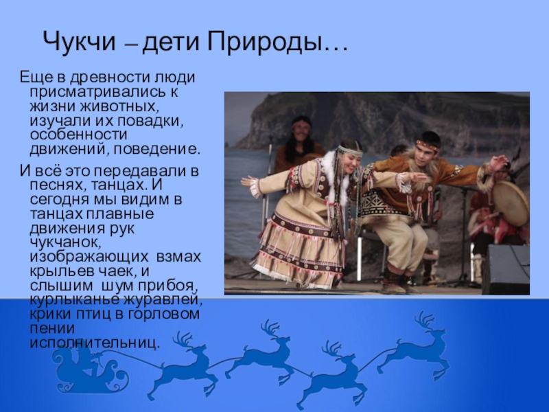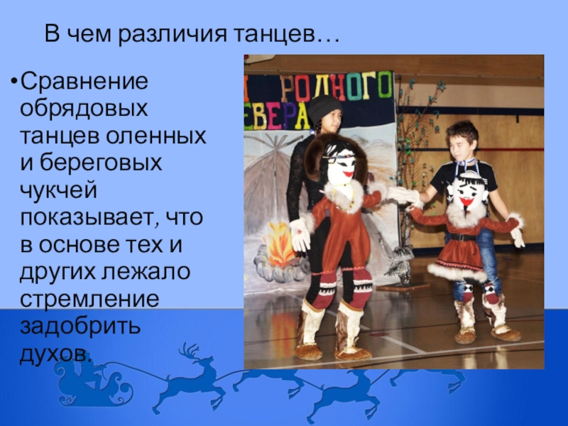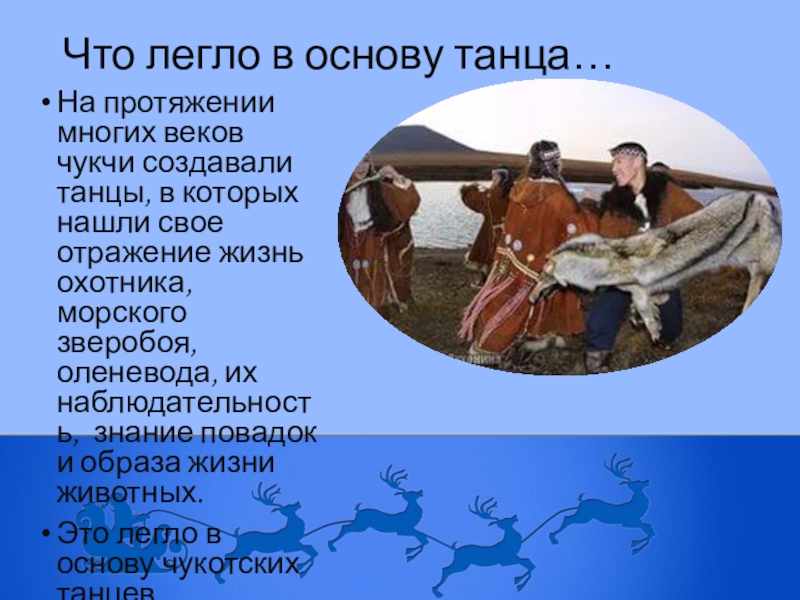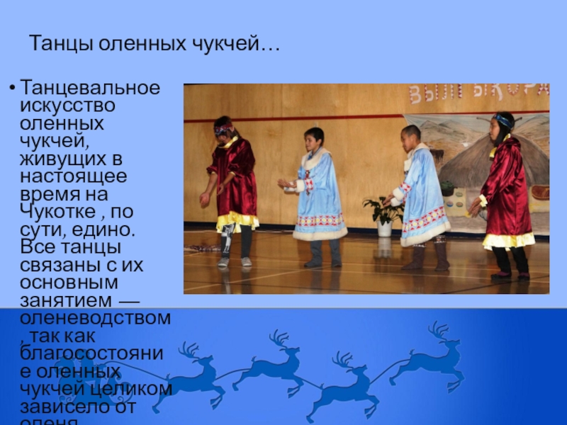 Чукотке , по сути, едино. Все танцы связаны с их основным занятием — оленеводством, так как благосостояние оленных чукчей целиком зависело от оленя.