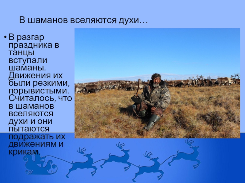 их были резкими, порывистыми. Считалось, что в шаманов вселяются духи и они пытаются подражать их движениям и крикам.