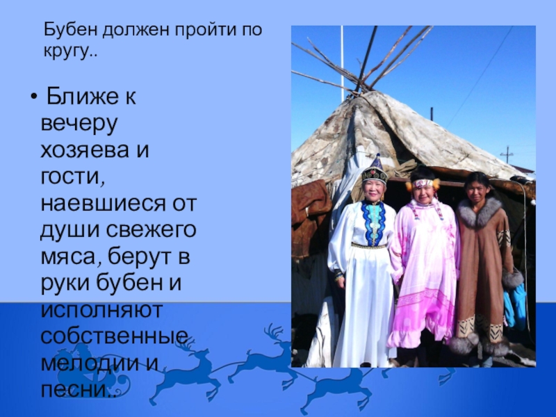 наевшиеся от души свежего мяса, берут в руки бубен и исполняют собственные мелодии и песни..