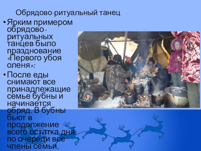 Ярким примером обрядово-ритуальных танцев было празднование «Первого убоя оленя»: