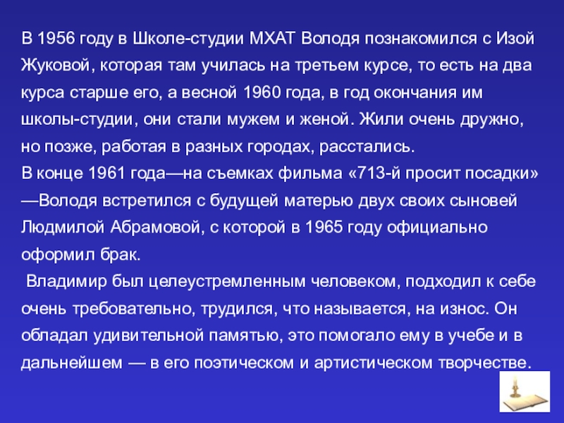 Слайд 5В 1956 году в Школе-студии МХАТ Володя познакомился с Изой Жуковой,
