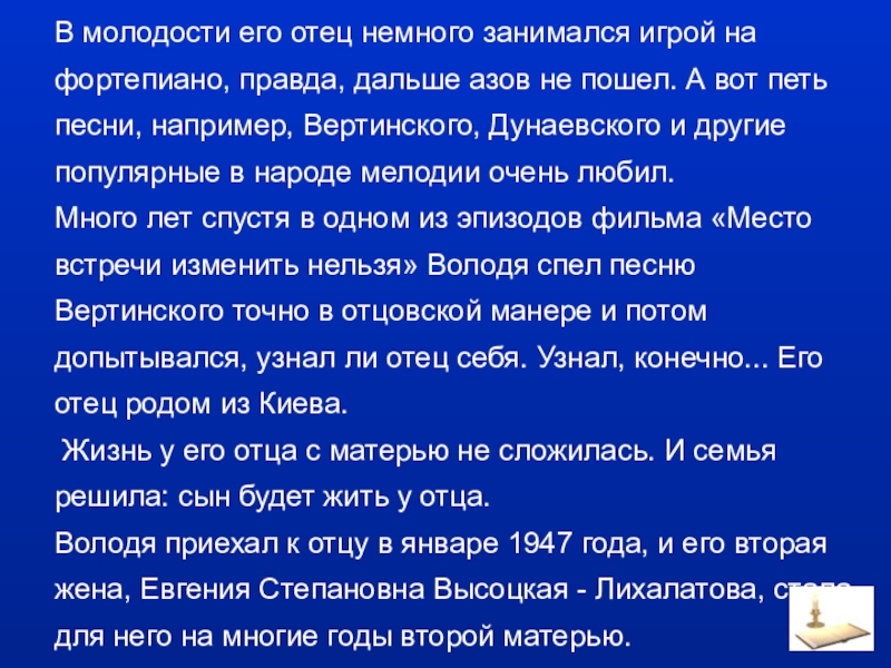 Много лет спустя в одном из эпизодов фильма «Место встречи изменить нельзя» Володя спел песню Вертинского точно в отцовской манере и потом допытывался, узнал ли отец себя. Узнал, конечно... Его отец родом из Киева.