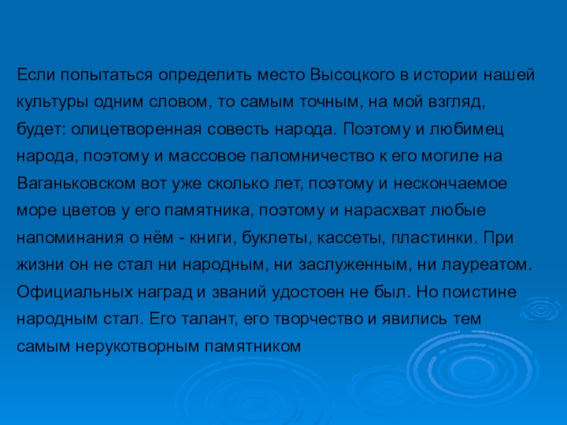 то самым точным, на мой взгляд, будет: олицетворенная совесть народа. Поэтому и любимец народа, поэтому и массовое паломничество к его могиле на Ваганьковском вот уже сколько лет, поэтому и нескончаемое море цветов у его памятника, поэтому и нарасхват любые напоминания о нём - книги, буклеты, кассеты, пластинки. При жизни он не стал ни народным, ни заслуженным, ни лауреатом. Официальных наград и званий удостоен не был. Но поистине народным стал. Его талант, его творчество и явились тем самым нерукотворным памятником