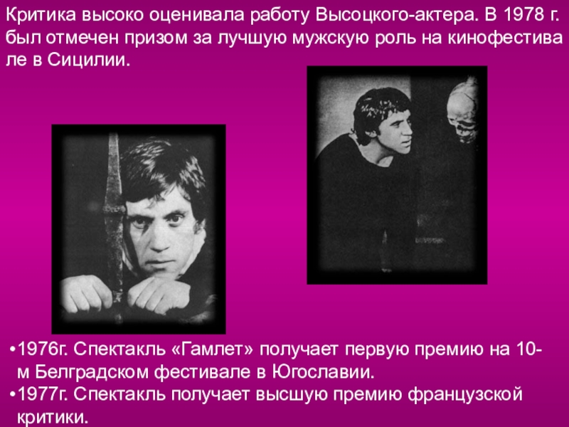 Слайд 12Критика высоко оценивала работу Высоцкого-актера. В 1978 г.