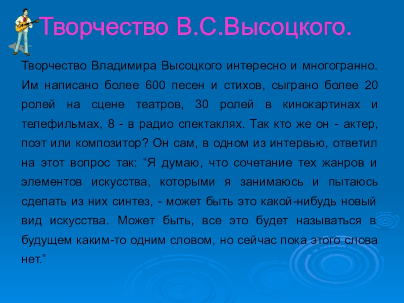 песен и стихов, сыграно более 20 ролей на сцене театров, 30 ролей в кинокартинах и телефильмах, 8 - в радио спектаклях. Так кто же он - актер, поэт или композитор? Он сам, в одном из интервью, ответил на этот вопрос так: “Я думаю, что сочетание тех жанров и элементов искусства, которыми я занимаюсь и пытаюсь сделать из них синтез, - может быть это какой-нибудь новый вид искусства. Может быть, все это будет называться в будущем каким-то одним словом, но сейчас пока этого слова нет.”
