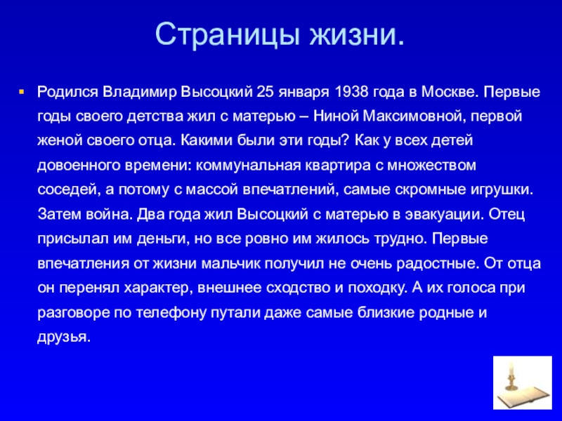 годы своего детства жил с матерью – Ниной Максимовной, первой женой своего отца. Какими были эти годы? Как у всех детей довоенного времени: коммунальная квартира с множеством соседей, а потому с массой впечатлений, самые скромные игрушки. Затем война. Два года жил Высоцкий с матерью в эвакуации. Отец присылал им деньги, но все ровно им жилось трудно. Первые впечатления от жизни мальчик получил не очень радостные. От отца он перенял характер, внешнее сходство и походку. А их голоса при разговоре по телефону путали даже самые близкие родные и друзья.