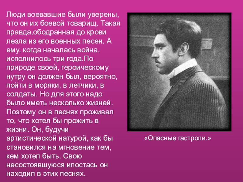 крови лезла из его военных песен. А ему, когда началась война, исполнилось три года.По природе своей, героическому нутру он должен был, вероятно, пойти в моряки, в летчики, в солдаты. Но для этого надо было иметь несколько жизней. Поэтому он в песнях проживал то, что хотел бы прожить в жизни. Он, будучи артистической натурой, как бы становился на мгновение тем, кем хотел быть. Свою несостоявшуюся ипостась он находил в этих песнях.