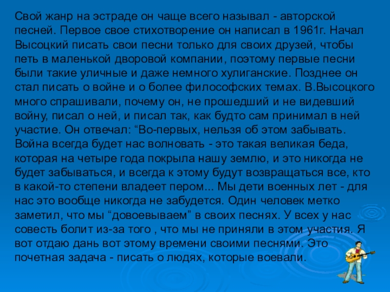 Первое свое стихотворение он написал в 1961г. Начал Высоцкий писать свои песни только для своих друзей, чтобы петь в маленькой дворовой компании, поэтому первые песни были такие уличные и даже немного хулиганские. Позднее он стал писать о войне и о более философских темах. В.Высоцкого много спрашивали, почему он, не прошедший и не видевший войну, писал о ней, и писал так, как будто сам принимал в ней участие. Он отвечал: “Во-первых, нельзя об этом забывать. Война всегда будет нас волновать - это такая великая беда, которая на четыре года покрыла нашу землю, и это никогда не будет забываться, и всегда к этому будут возвращаться все, кто в какой-то степени владеет пером... Мы дети военных лет - для нас это вообще никогда не забудется. Один человек метко заметил, что мы “довоевываем” в своих песнях. У всех у нас совесть болит из-за того , что мы не приняли в этом участия. Я вот отдаю дань вот этому времени своими песнями. Это почетная задача - писать о людях, которые воевали.