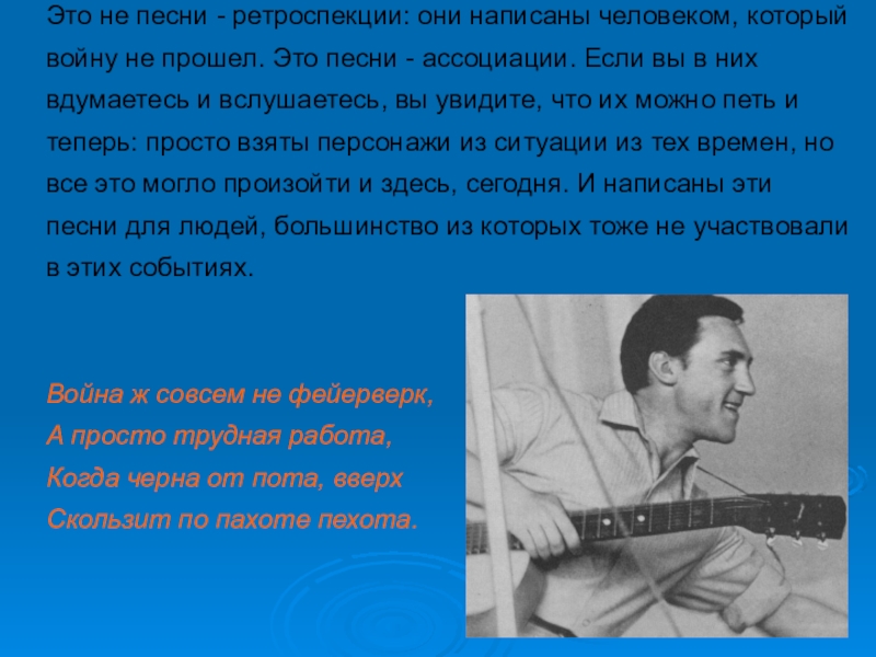Слайд 8Это не песни - ретроспекции: они написаны человеком, который войну не