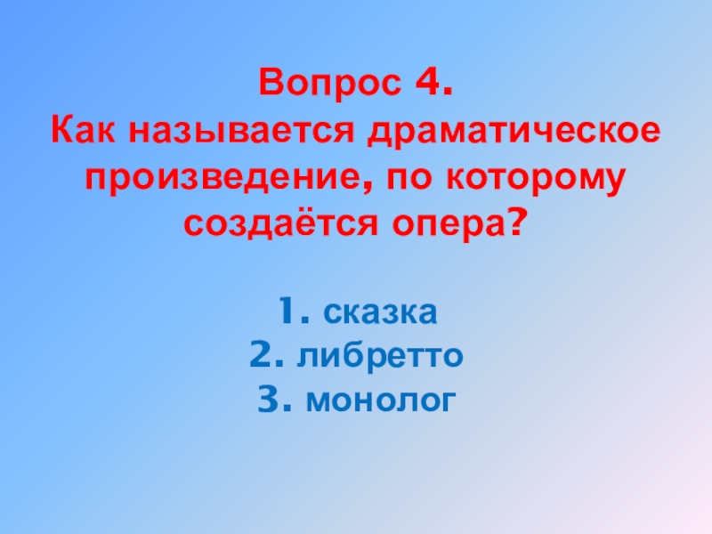 Слайд 5Вопрос 4. Как называется драматическое произведение, по которому создаётся опера? 1. сказка 2.