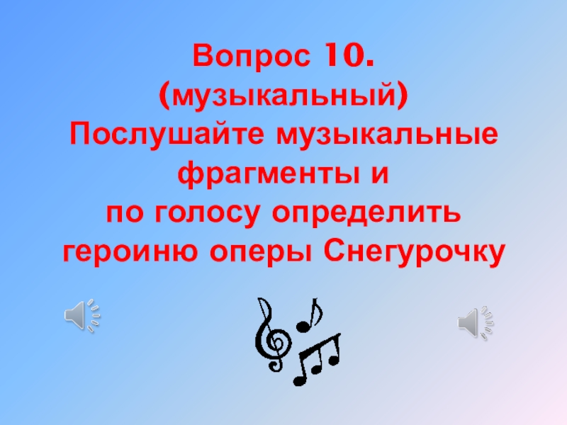 Слайд 12Вопрос 10. (музыкальный) Послушайте музыкальные фрагменты и по голосу определить героиню оперы Снегурочку