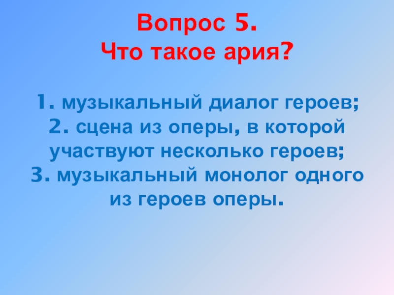 Вопрос 5. Что такое ария?  1. музыкальный диалог героев; 2. сцена из оперы, в которой участвуют