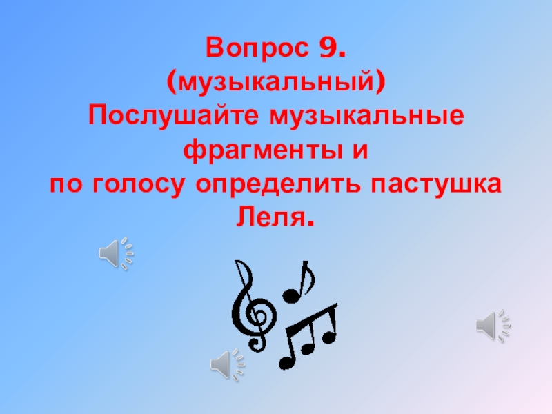 Слайд 10Вопрос 9. (музыкальный) Послушайте музыкальные фрагменты и по голосу определить пастушка Леля.