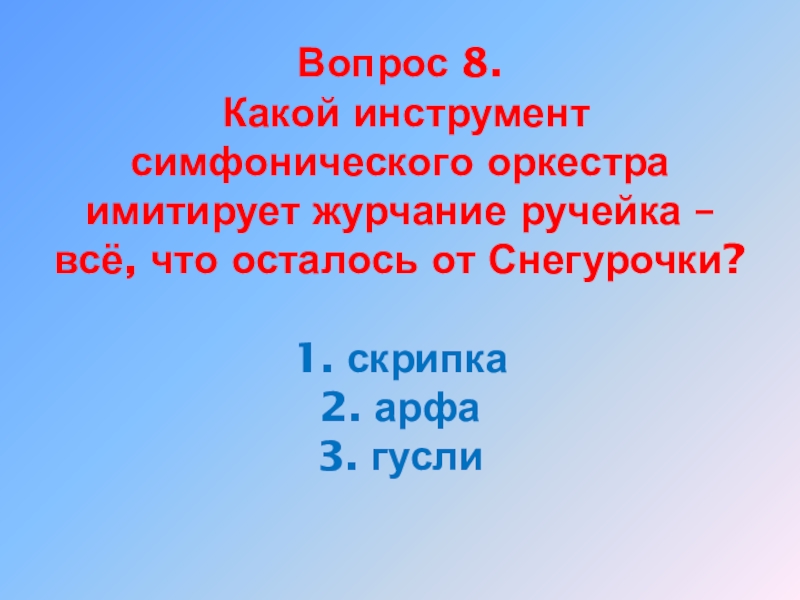 Вопрос 8.  Какой инструмент симфонического оркестра имитирует журчание ручейка – всё, что осталось от Снегурочки?
