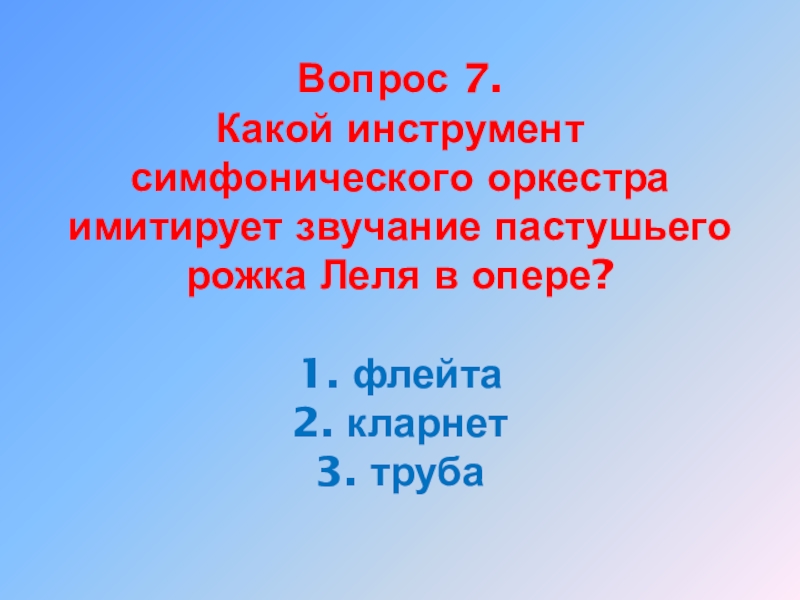 Слайд 8Вопрос 7. Какой инструмент симфонического оркестра имитирует звучание пастушьего рожка Леля в