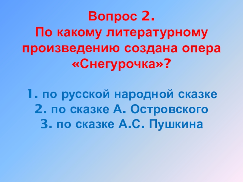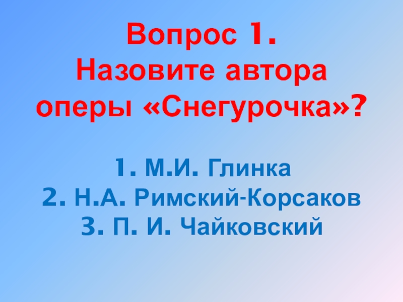 Слайд 2Вопрос 1. Назовите автора оперы «Снегурочка»? 1. М.И.