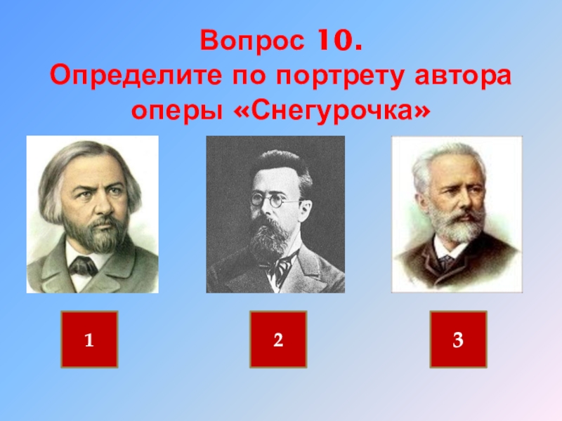 Вопрос 10. Определите по портрету автора оперы «Снегурочка»123