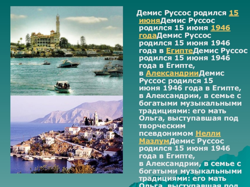 родился 15 июня 1946 года в ЕгиптеДемис Руссос родился 15 июня 1946 года в Египте, в АлександрииДемис Руссос родился 15 июня 1946 года в Египте, в Александрии, в семье с богатыми музыкальными традициями: его мать Ольга, выступавшая под творческим псевдонимом Нелли МазлумДемис Руссос родился 15 июня 1946 года в Египте, в Александрии, в семье с богатыми музыкальными традициями: его мать Ольга, выступавшая под творческим псевдонимом Нелли Мазлум (1929—2003) — танцовщица итальянскогоДемис Руссос родился 15 июня 1946 года в Египте, в Александрии, в семье с богатыми музыкальными традициями: его мать Ольга, выступавшая под творческим псевдонимом Нелли Мазлум (1929—2003) — танцовщица итальянского и греческогоДемис Руссос родился 15 июня 1946 года в Египте, в Александрии, в семье с богатыми музыкальными традициями: его мать Ольга, выступавшая под творческим псевдонимом Нелли Мазлум (1929—2003) — танцовщица итальянского и греческого происхождения, а отец (инженер греческого происхождения Джордж (Йоргос) Руссос) играл на классической гитареДемис Руссос родился 15 июня 1946 года в Египте, в Александрии, в семье с богатыми музыкальными традициями: его мать Ольга, выступавшая под творческим псевдонимом Нелли Мазлум (1929—2003) — танцовщица итальянского и греческого происхождения, а отец (инженер греческого происхождения Джордж (Йоргос) Руссос) играл на классической гитаре. Во время учёбы в музыкальной школе Демис освоил игру на гитареДемис Руссос родился 15 июня 1946 года в Египте, в Александрии, в семье с богатыми музыкальными традициями: его мать Ольга, выступавшая под творческим псевдонимом Нелли Мазлум (1929—2003) — танцовщица итальянского и греческого происхождения, а отец (инженер греческого происхождения Джордж (Йоргос) Руссос) играл на классической гитаре. Во время учёбы в музыкальной школе Демис освоил игру на гитаре, трубеДемис Руссос родился 15 июня 1946 года в Египте, в Александрии, в семье с богатыми музыкальными традициями: его мать Ольга, выступавшая под творческим псевдонимом Нелли Мазлум (1929—2003) — танцовщица итальянского и греческого происхождения, а отец (инженер греческого происхождения Джордж (Йоргос) Руссос) играл на классической гитаре. Во время учёбы в музыкальной школе Демис освоил игру на гитаре, трубе, контрабасеДемис Руссос родился 15 июня 1946 года в Египте, в Александрии, в семье с богатыми музыкальными традициями: его мать Ольга, выступавшая под творческим псевдонимом Нелли Мазлум (1929—2003) — танцовщица итальянского и греческого происхождения, а отец (инженер греческого происхождения Джордж (Йоргос) Руссос) играл на классической гитаре. Во время учёбы в музыкальной школе Демис освоил игру на гитаре, трубе, контрабасе и органеДемис Руссос родился 15 июня 1946 года в Египте, в Александрии, в семье с богатыми музыкальными традициями: его мать Ольга, выступавшая под творческим псевдонимом Нелли Мазлум (1929—2003) — танцовщица итальянского и греческого происхождения, а отец (инженер греческого происхождения Джордж (Йоргос) Руссос) играл на классической гитаре. Во время учёбы в музыкальной школе Демис освоил игру на гитаре, трубе, контрабасе и органе. В середине 1950-х годов семья переехала в Грецию.