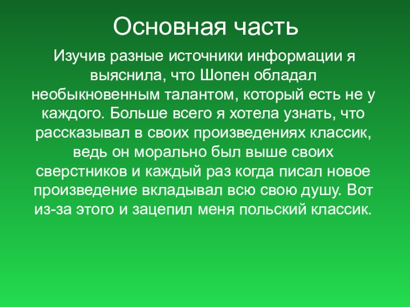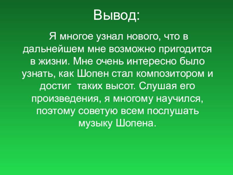 пригодится в жизни. Мне очень интересно было узнать, как Шопен стал композитором и достиг таких высот. Слушая его произведения, я многому научился, поэтому советую всем послушать музыку Шопена.