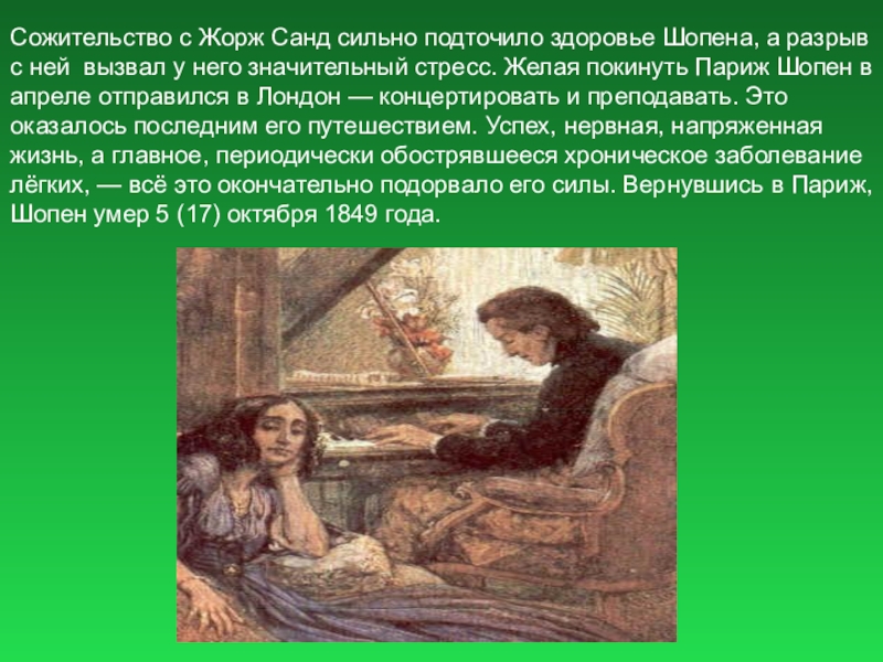 Слайд 9 Сожительство с Жорж Санд сильно подточило здоровье Шопена,