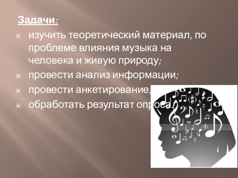 изучить теоретический материал, по проблеме влияния музыка на человека и