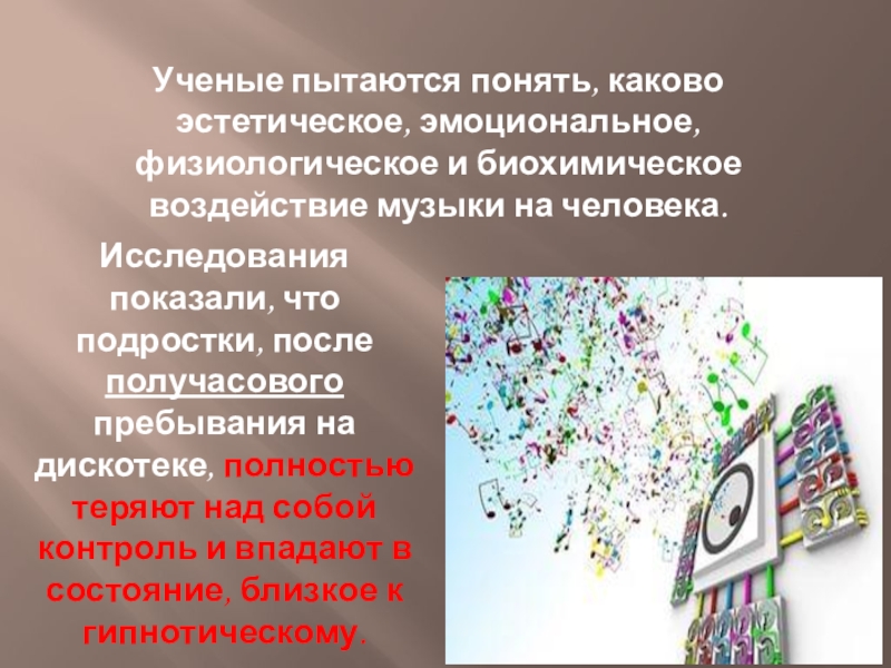 Слайд 8Ученые пытаются понять, каково эстетическое, эмоциональное, физиологическое и биохимическое воздействие музыки