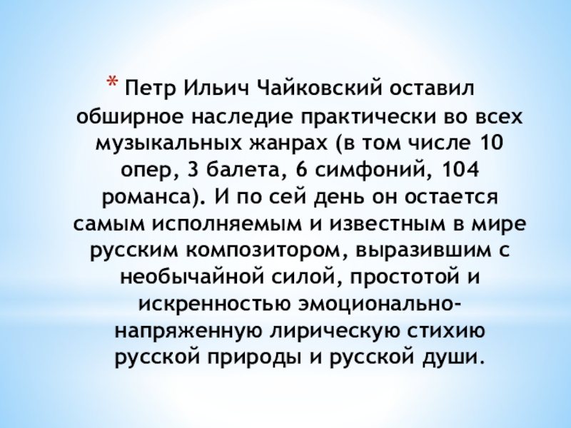 Слайд 10Петр Ильич Чайковский оставил обширное наследие практически во всех музыкальных жанрах