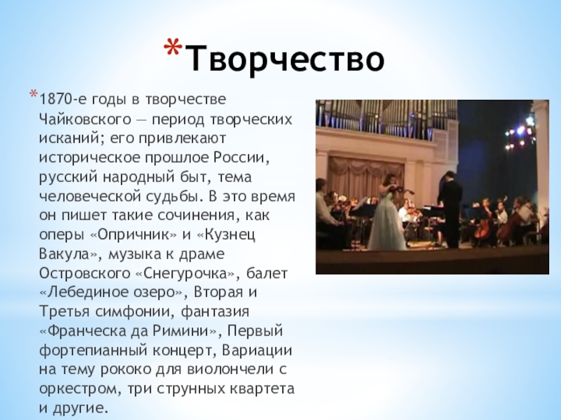 Творчество1870-е годы в творчестве Чайковского ― период творческих исканий; его привлекают историческое прошлое России, русский народный быт,